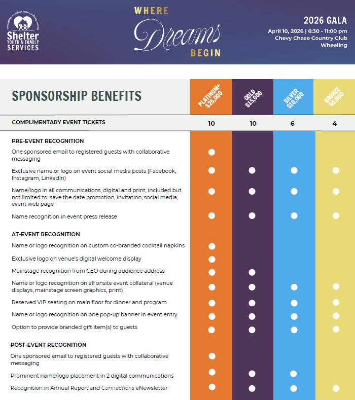 Remember your childhood dreams and the imagination that made everything feel possible? This theme celebrates that same spark in every child and the moment it starts to shine. The Shelter helps build a safe, nurturing home base where hope grows into confidence and confidence grows into a future. This gala is our chance to show up with joy and purpose so dreams do not just begin, they start becoming real.